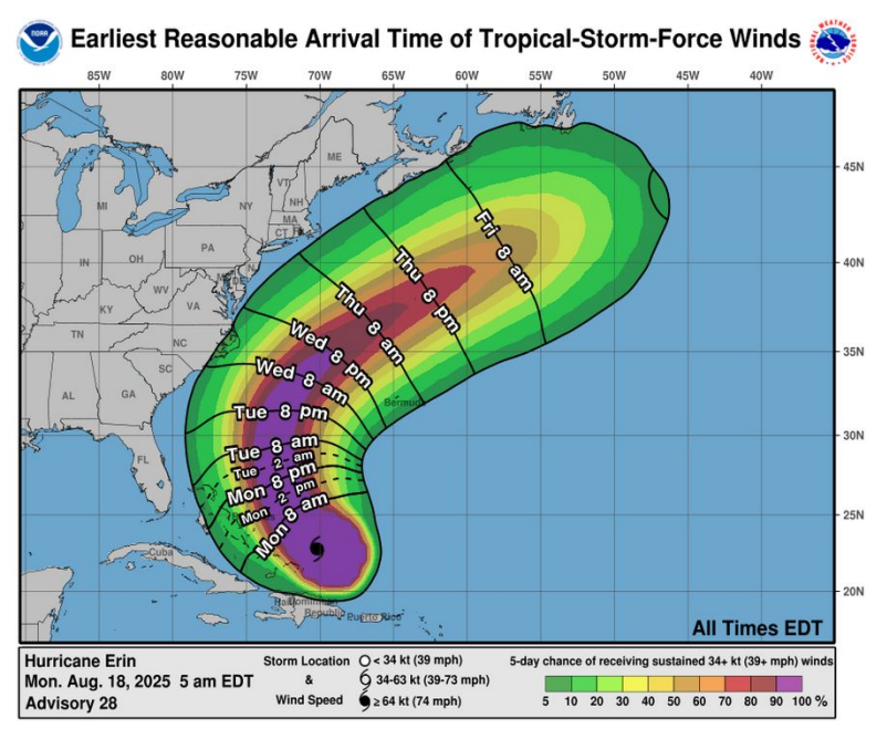 “Despite the path of Erin forecast to remain offshore, the threat for life-threatening rip currents, damaging beach erosion, major inundation and overwash and extremely dangerous surf is expected,” the U.S. National Weather Service at Newport/Morehead City briefing said.